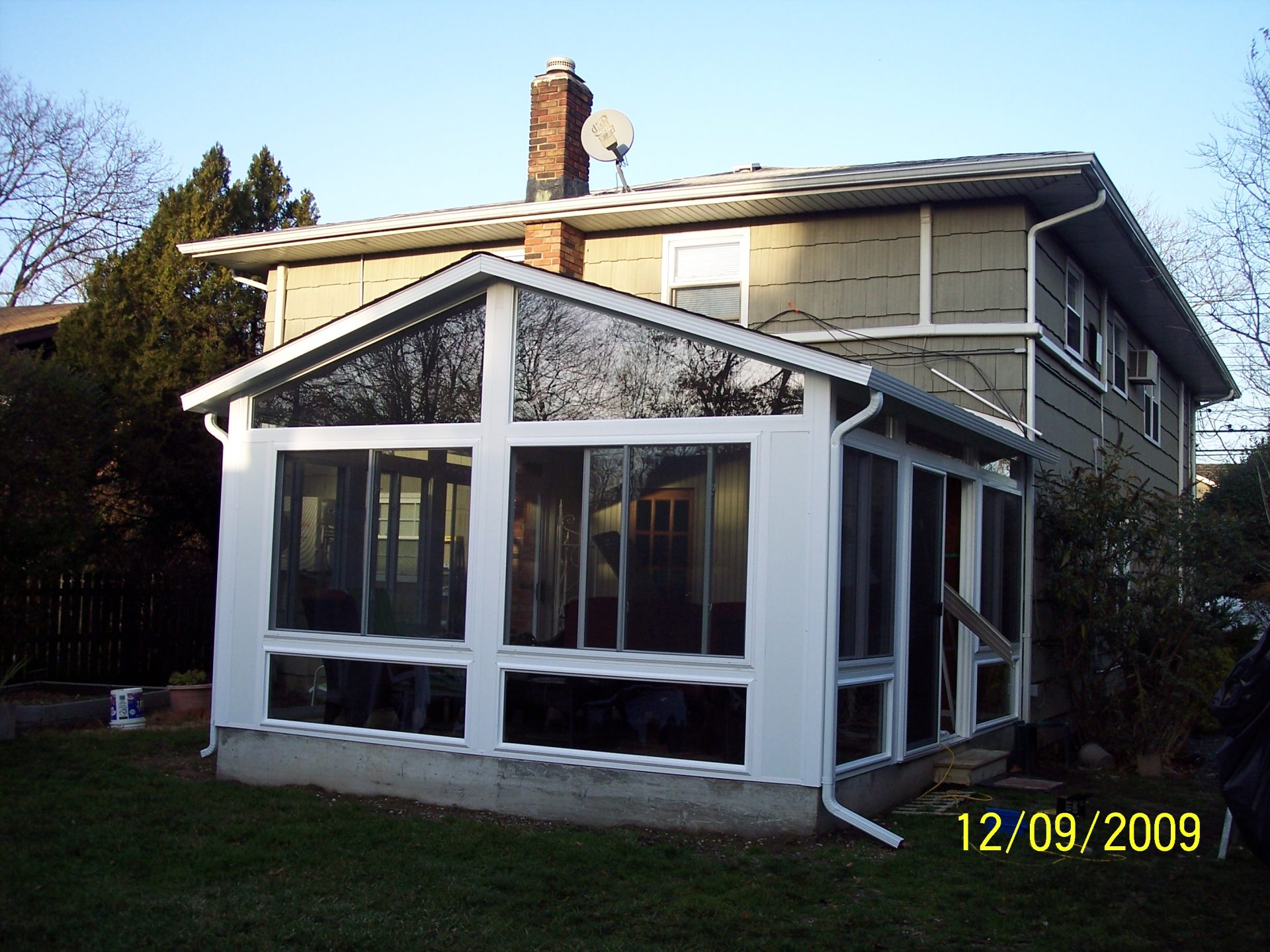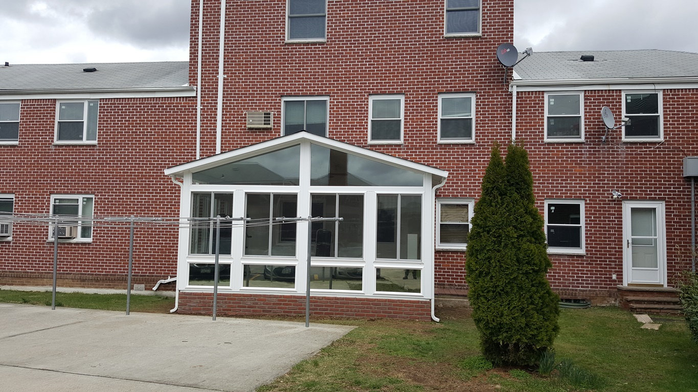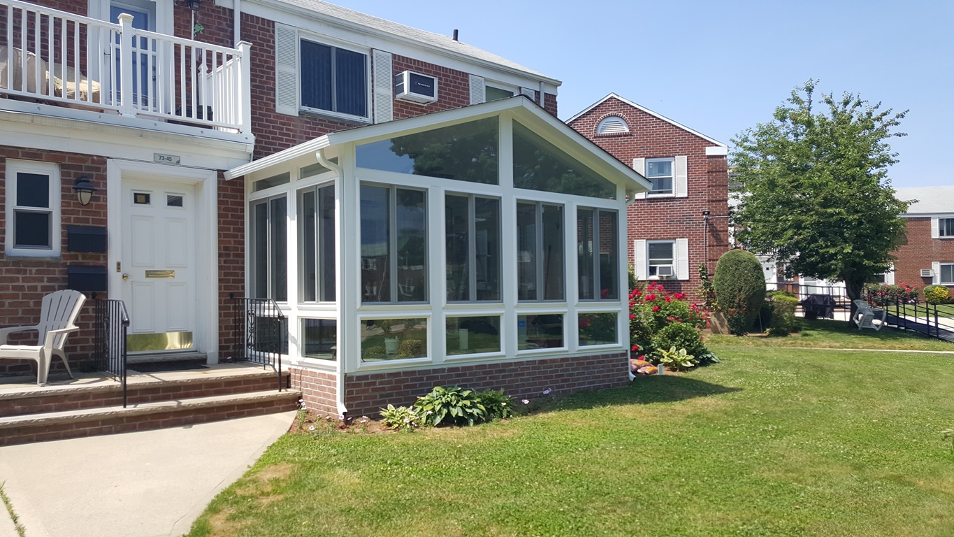 Gable sunroom in Queens connected to AC compressor