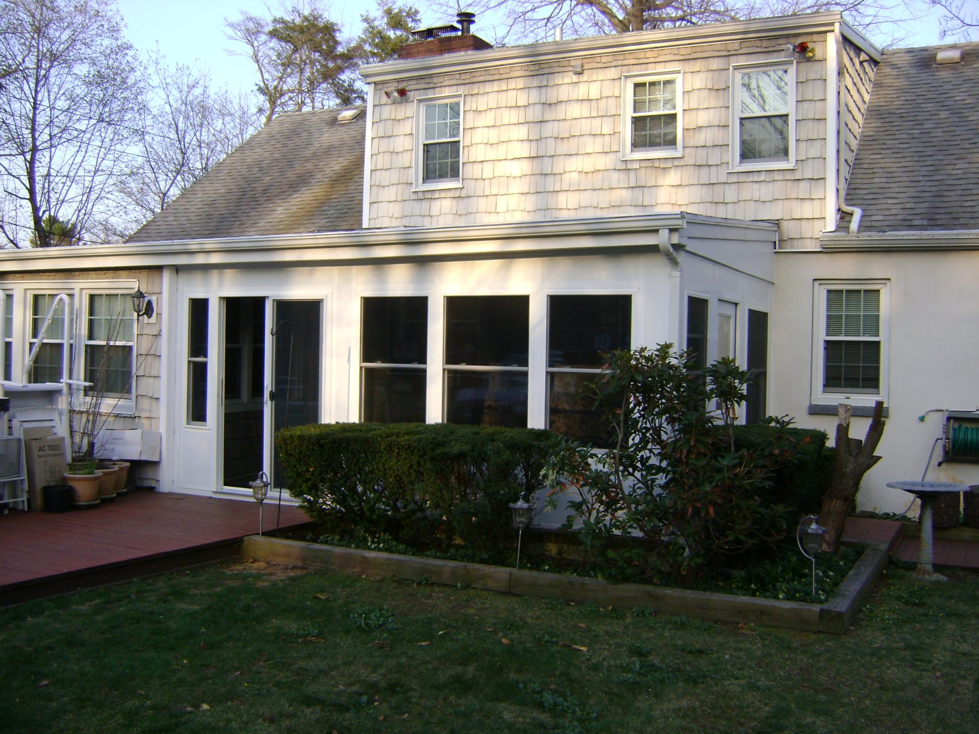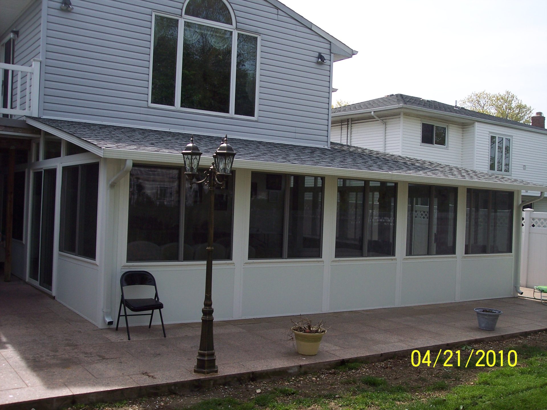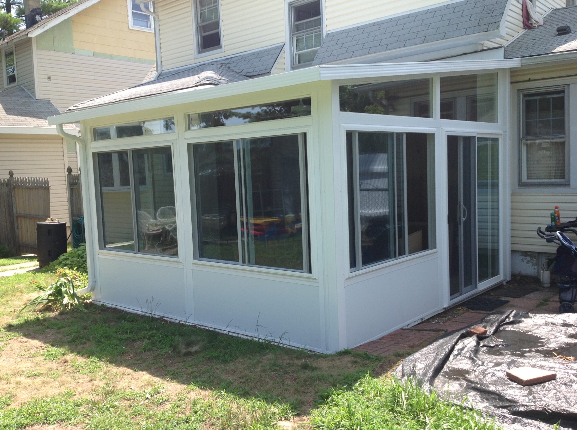 Gable sunroom in Queens connected to AC compressor