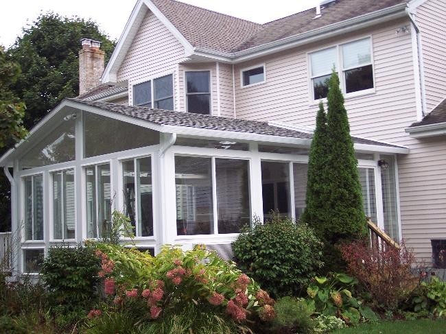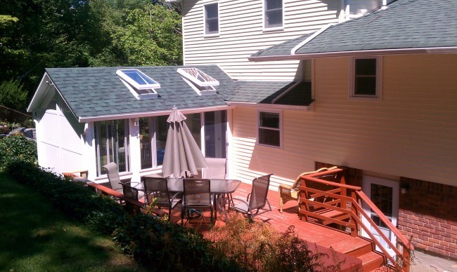 Gable Sunroom roof tie-in with matching shingles between roof and...