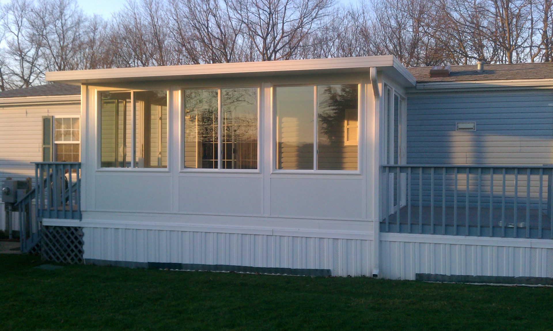 Gable Sunroom on ranch home with insulation and skirting