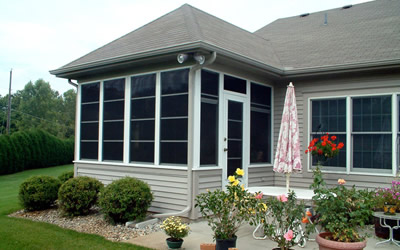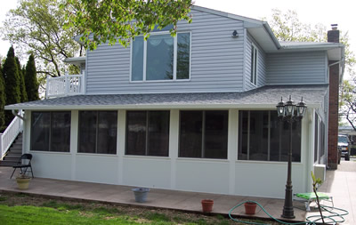Gable Sunroom roof tie-in with matching shingles between roof and...