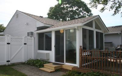 Gable sunroom in Bayport with glass sidelights